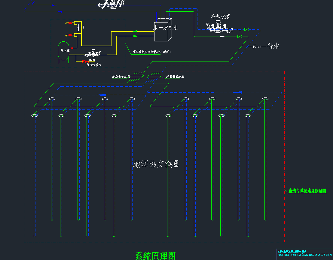 係統組成:地源熱泵主機+磁懸浮離心式機組+模塊式機房+風機盤管+全熱回收式新風機+中央除濕+地板輻射采暖+全熱回收式生活熱水;